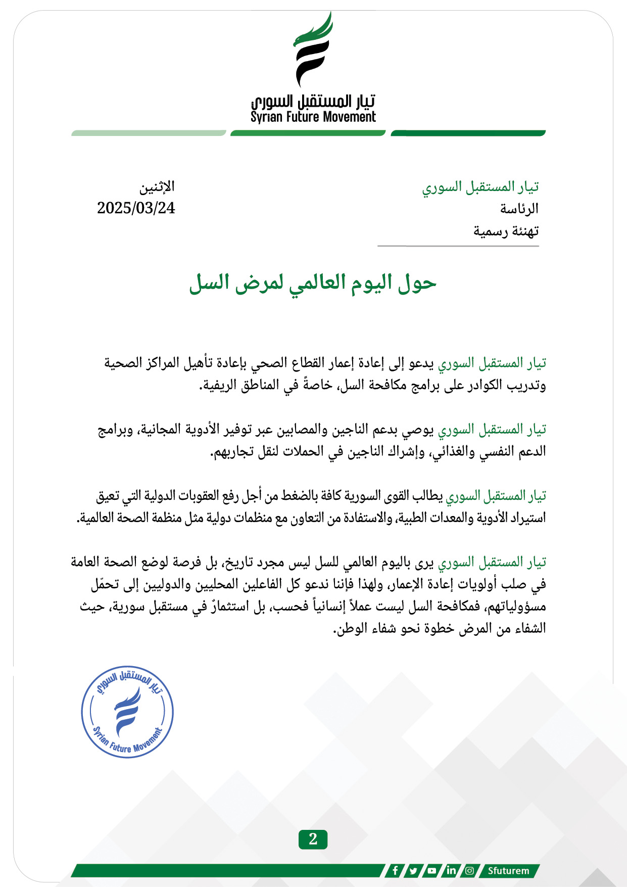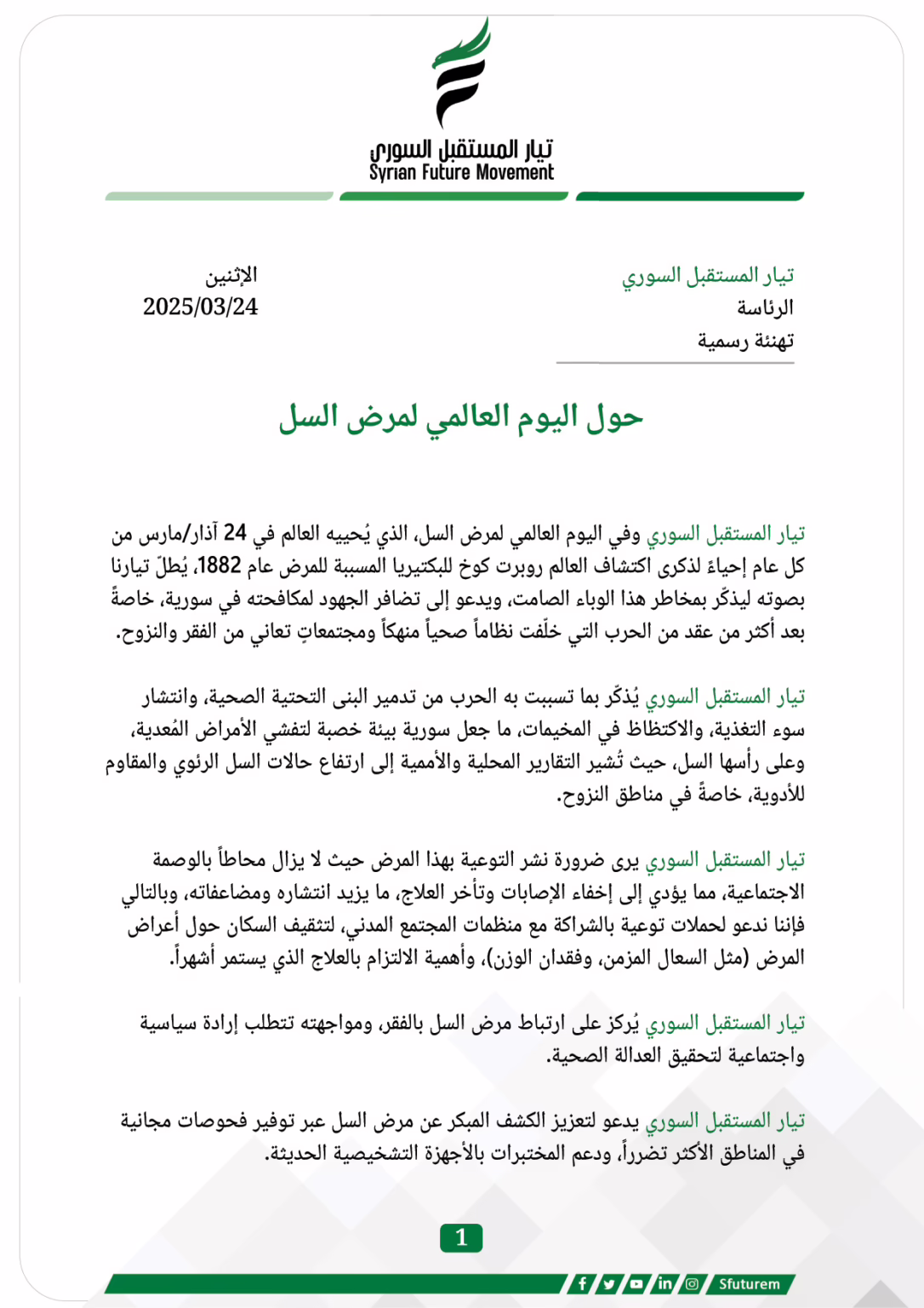 تيار المستقبل السوري يرى باليوم العالمي للسل ليس مجرد تاريخ، بل فرصة لوضع الصحة العامة في صلب أولويات إعادة الإعمار، ولهذا فإننا ندعو كل الفاعلين المحليين والدوليين إلى تحمّل مسؤولياتهم، فمكافحة السل ليست عملاً إنسانياً فحسب، بل استثمارٌ في مستقبل سورية، حيث الشفاء من المرض خطوة نحو شفاء الوطن.