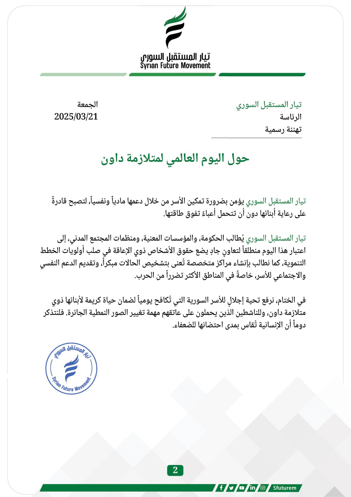 تيار المستقبل السوري يُنبه إلى أن الأشخاص ذوو متلازمة داون أثبتوا عبر تجارب عالمية عديدة، أنهم قادرون على الإبداع والإنتاج عندما تُتاح لهم الفرص، وتُزال الحواجز الاجتماعية والاقتصادية التي تحول دون تمتعهم بحقوقهم، لذلك، فإن ترسيخ ثقافة الدمج في المدارس وأماكن العمل، وتوفير الرعاية الصحية المتخصصة، وتشريع القوانين التي تحمي أسرهم من التمييز، هي خطواتٌ لا تقبل التأجيل في مسيرة إعادة إعمار الإنسان السوري.