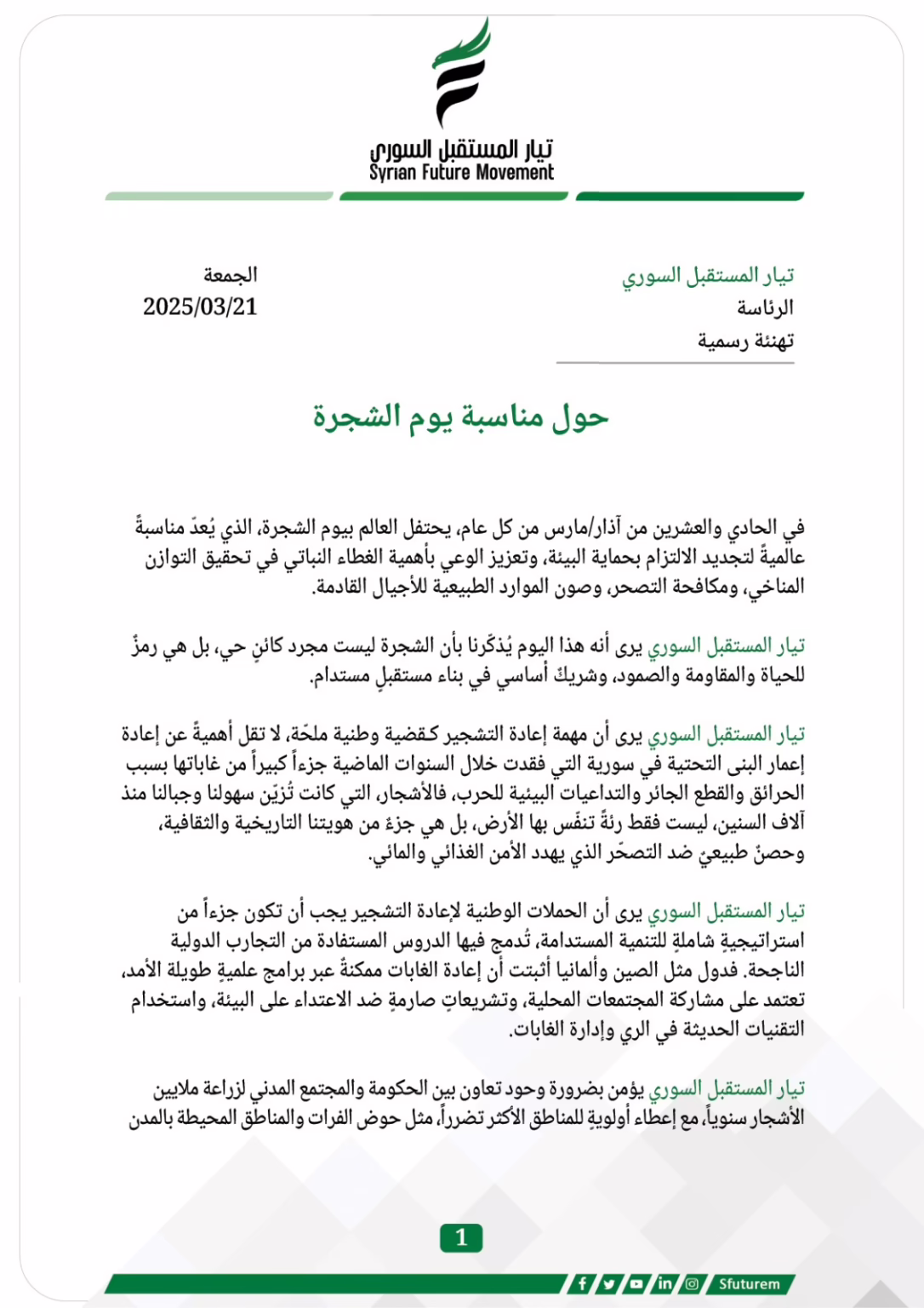 تيار المستقبل السوري يرى أنه هذا اليوم يُذكّرنا بأن الشجرة ليست مجرد كائنٍ حي، بل هي رمزٌ للحياة والمقاومة والصمود، وشريكٌ أساسي في بناء مستقبلٍ مستدام.