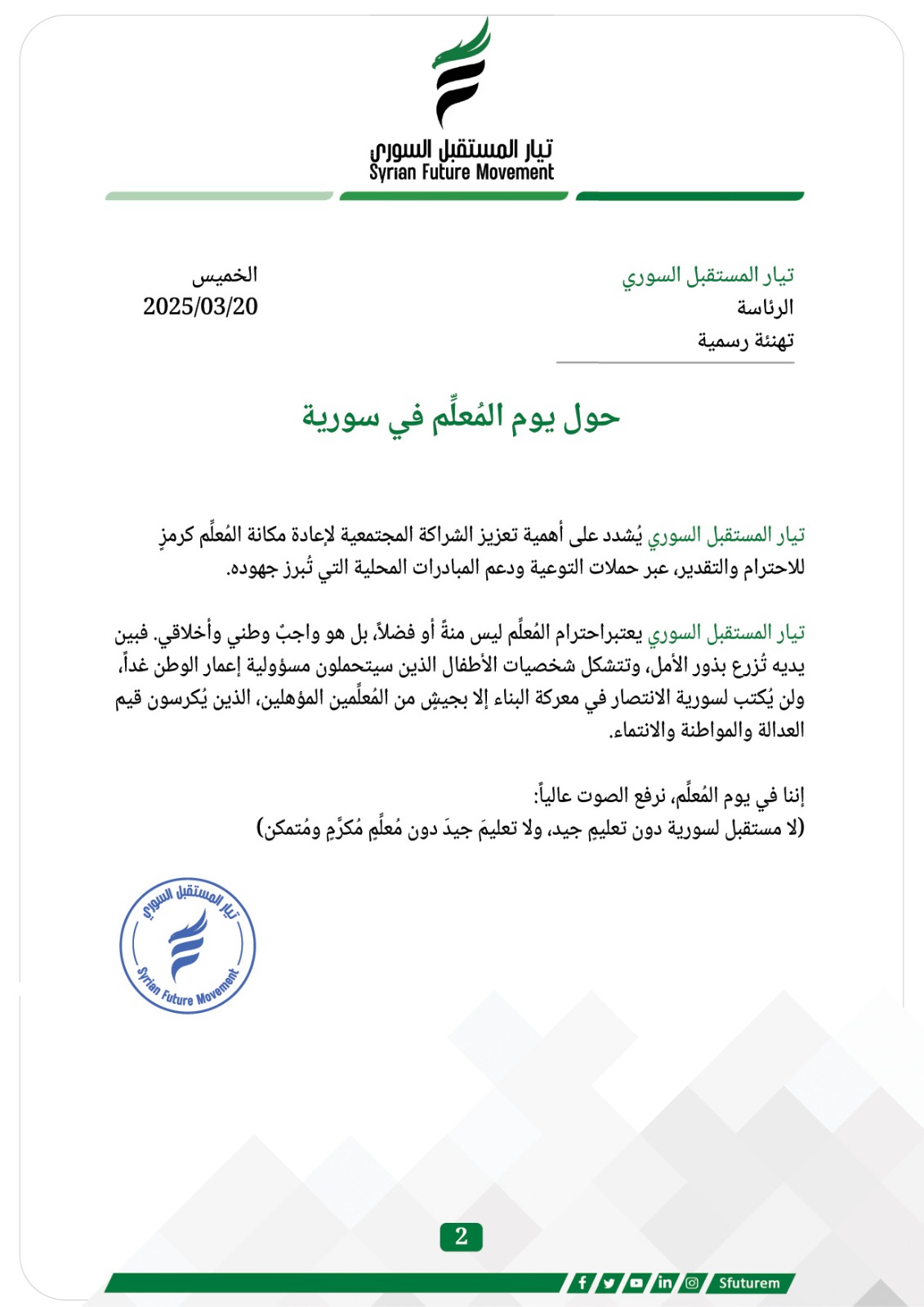 تيار المستقبل السوري في هذا اليوم الذي نُحيي فيه ذكرى عطاءات المُعلِّمين والمُعلِّمات، ينطلق صوتنا من قلب سورية المُحبّة لِنُهدي تحية إجلالٍ وإكبارٍ لأصحاب الرسالة السامية، رسالة بناء العقول وتنوير الأجيال. فالمُعلِّم ليس مجرد ناقلٍ للمعرفة، بل هو حجر الأساس في صياغة مستقبل الأمة، وصانعٌ لِوعيها، وحارسٌ لقيمها وإرثها الإنساني.