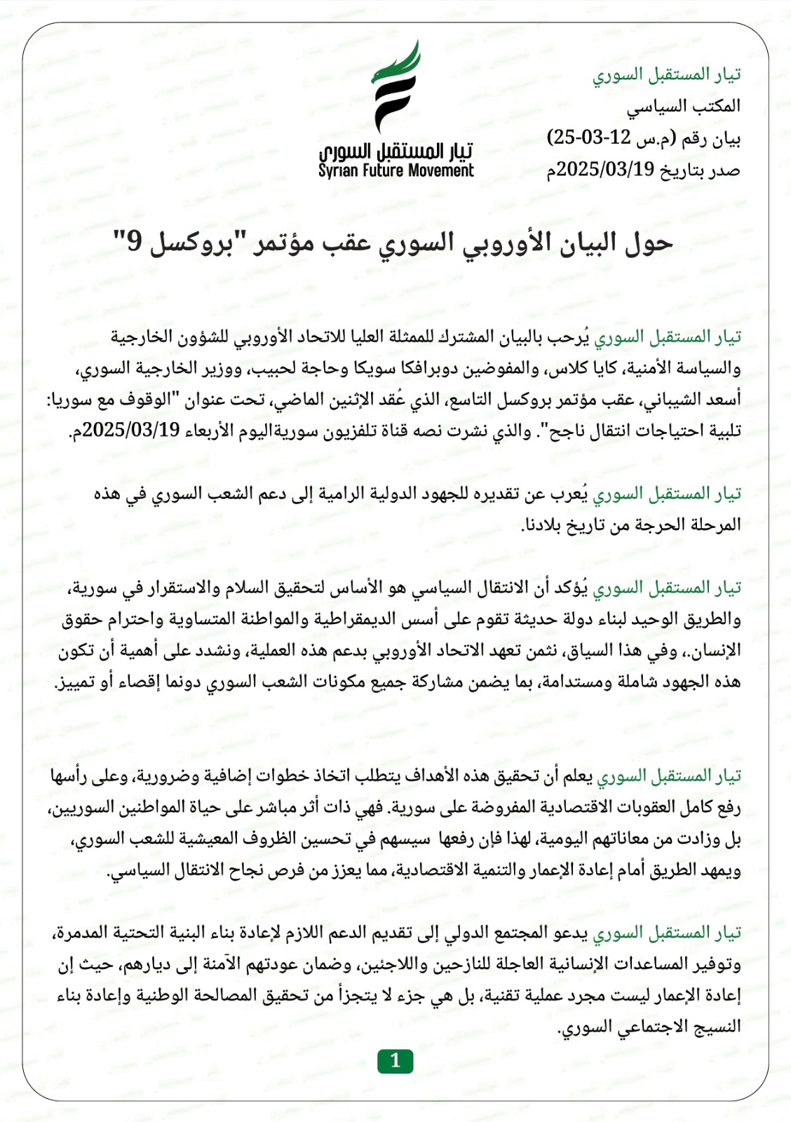 تيار المستقبل السوري يُرحب بالبيان المشترك للممثلة العليا للاتحاد الأوروبي للشؤون الخارجية والسياسة الأمنية، كايا كلاس، والمفوضين دوبرافكا سويكا وحاجة لحبيب، ووزير الخارجية السوري، أسعد الشيباني، عقب مؤتمر بروكسل التاسع، الذي عُقد الإثنين الماضي، تحت عنوان "الوقوف مع سوريا: تلبية احتياجات انتقال ناجح". والذي نشرت نصه قناة تلفزيون سوريةاليوم الأربعاء 19/03/2025م.