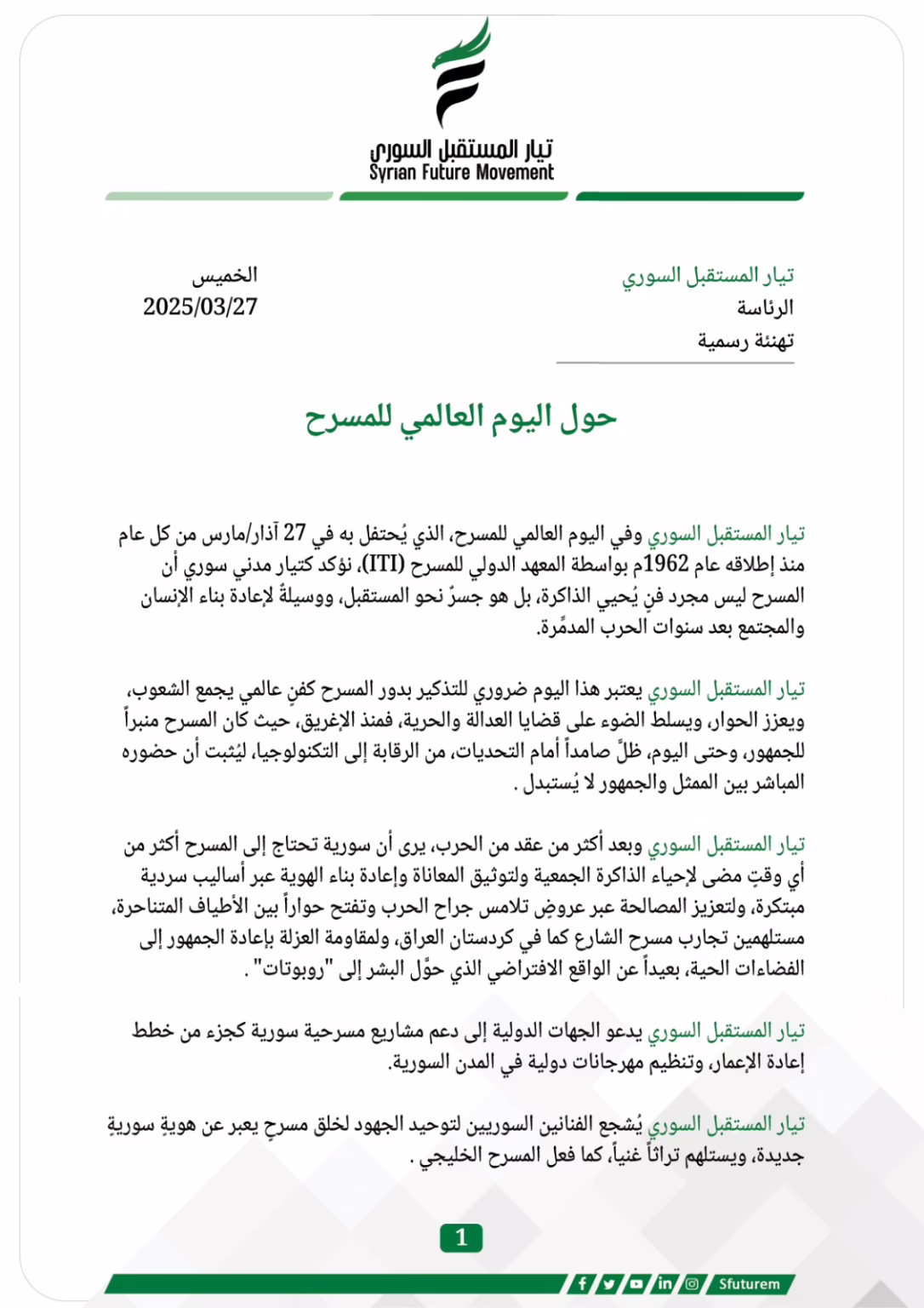 تيار المستقبل السوري وفي اليوم العالمي للمسرح، الذي يُحتفل به في 27 آذار/مارس من كل عام منذ إطلاقه عام 1962م بواسطة المعهد الدولي للمسرح (ITI)، نؤكد كتيار مدني سوري أن المسرح ليس مجرد فنٍ يُحيي الذاكرة، بل هو جسرٌ نحو المستقبل، ووسيلةٌ لإعادة بناء الإنسان والمجتمع بعد سنوات الحرب المدمِّرة.