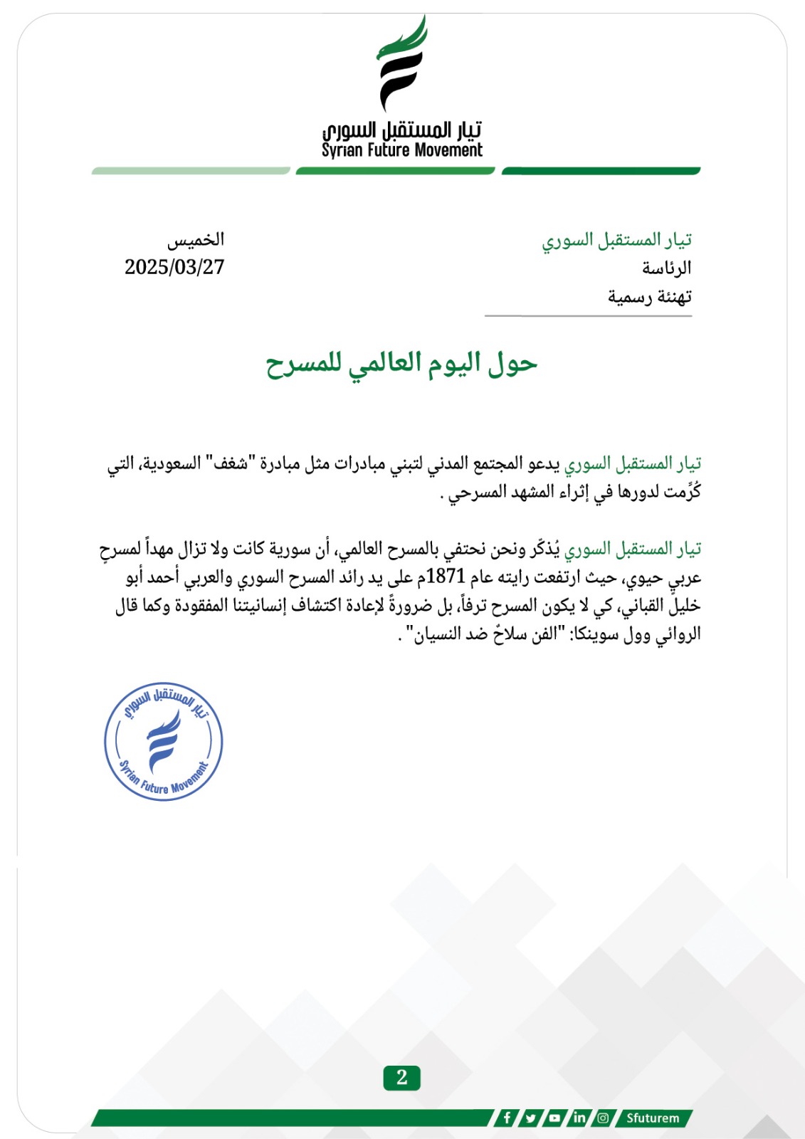 تيار المستقبل السوري يُذكّر ونحن نحتفي بالمسرح العالمي، أن سورية كانت ولا تزال مهداً لمسرحٍ عربيٍ حيوي، حيث ارتفعت رايته عام 1871م على يد رائد المسرح السوري والعربي أحمد أبو خليل القباني، كي لا يكون المسرح ترفاً، بل ضرورةً لإعادة اكتشاف إنسانيتنا المفقودة وكما قال الروائي وول سوينكا: "الفن سلاحٌ ضد النسيان" .