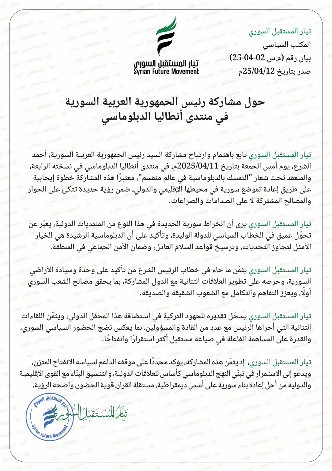 تيار المستقبل السوري، إذ يثمّن هذه المشاركة، يؤكد مجددًا على موقفه الداعم لسياسة الانفتاح المتزن، ويدعو إلى الاستمرار في تبنّي النهج الدبلوماسي كأساس للعلاقات الدولية، والتنسيق البنّاء مع القوى الإقليمية والدولية من أجل إعادة بناء سورية على أسس ديمقراطية، مستقلة القرار، قوية الحضور، واضحة الرؤية.