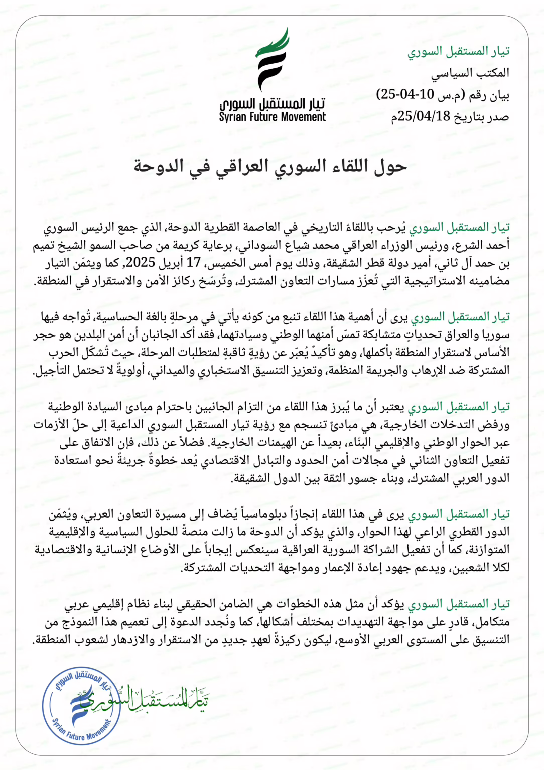 تيار المستقبل السوري يُرحب باللقاءٌ التاريخي في العاصمة القطرية الدوحة، الذي جمع الرئيس السوري أحمد الشرع، ورئيس الوزراء العراقي محمد شياع السوداني، برعاية كريمة من صاحب السمو الشيخ تميم بن حمد آل ثاني، أمير دولة قطر الشقيقة، وذلك يوم أمس الخميس، 17 أبريل 2025, كما ويثمّن التيار مضامينه الاستراتيجية التي تُعزّز مسارات التعاون المشترك، وتُرسّخ ركائز الأمن والاستقرار في المنطقة.