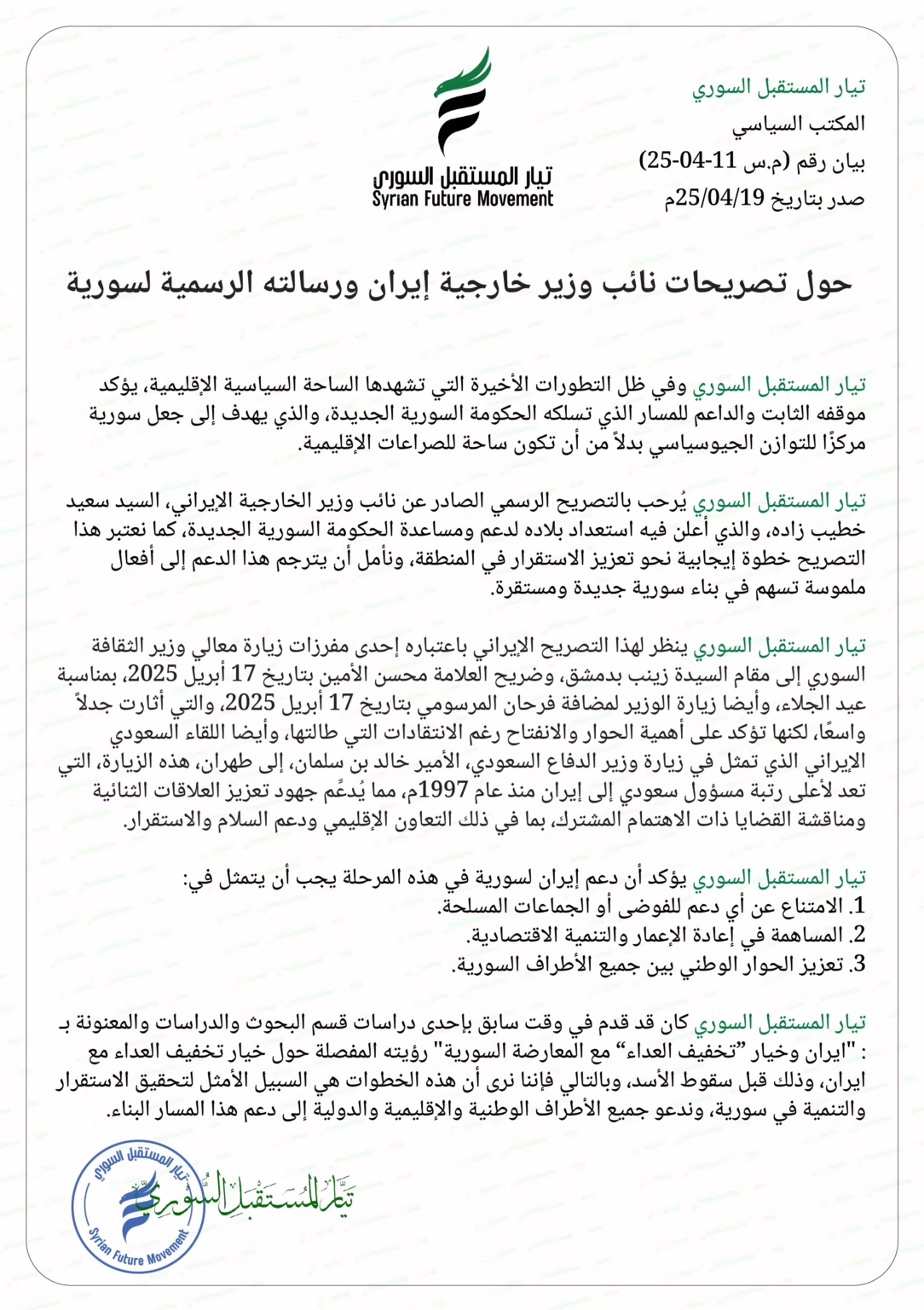 تيار المستقبل السوري يُرحب بالتصريح الرسمي الصادر عن نائب وزير الخارجية الإيراني، السيد سعيد خطيب زاده، والذي أعلن فيه استعداد بلاده لدعم ومساعدة الحكومة السورية الجديدة، كما نعتبر هذا التصريح خطوة إيجابية نحو تعزيز الاستقرار في المنطقة، ونأمل أن يترجم هذا الدعم إلى أفعال ملموسة تسهم في بناء سورية جديدة ومستقرة.