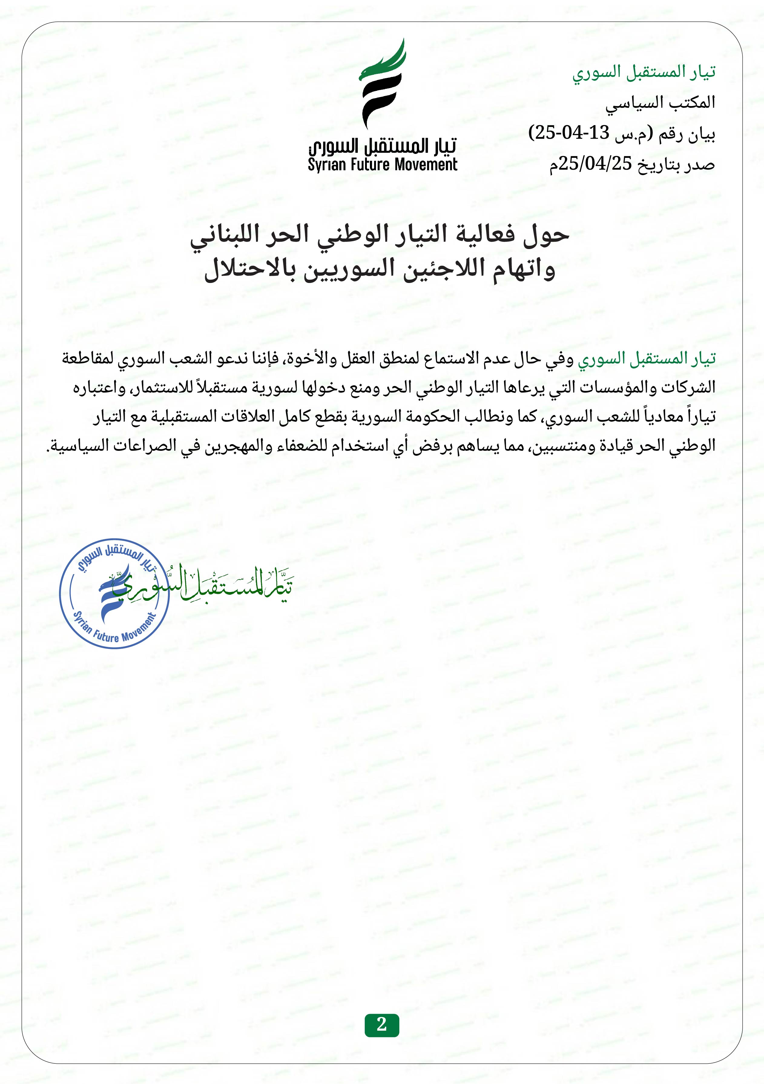 تيار المستقبل السوري يدعو إلى تعزيز العلاقات الأخوية بين الشعبين السوري واللبناني، والعمل على بناء مستقبل مشترك يقوم على الاحترام المتبادل والتعاون، ونؤكد أن أي خطاب أو سياسة تدفع نحو الكراهية والحقد لا تخدم سوى أعداء السلام والاستقرار.