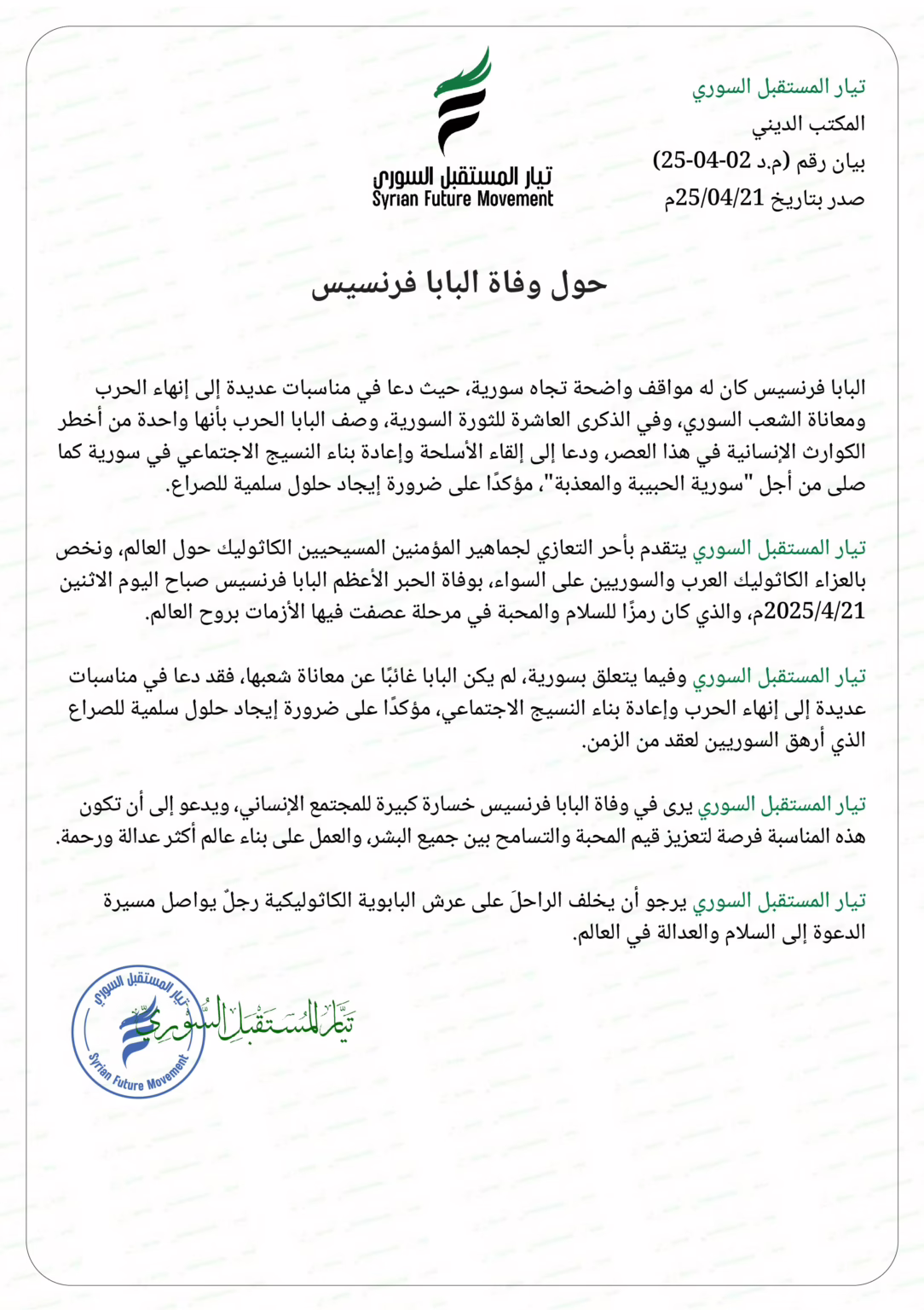 تيار المستقبل السوري يتقدم بأحر التعازي لجماهير المؤمنين المسيحيين الكاثوليك حول العالم، ونخص بالعزاء الكاثوليك العرب والسوريين على السواء، بوفاة الحبر الأعظم البابا فرنسيس صباح اليوم الاثنين 21/4/2025م، والذي كان رمزًا للسلام والمحبة في مرحلة عصفت فيها الأزمات بروح العالم.