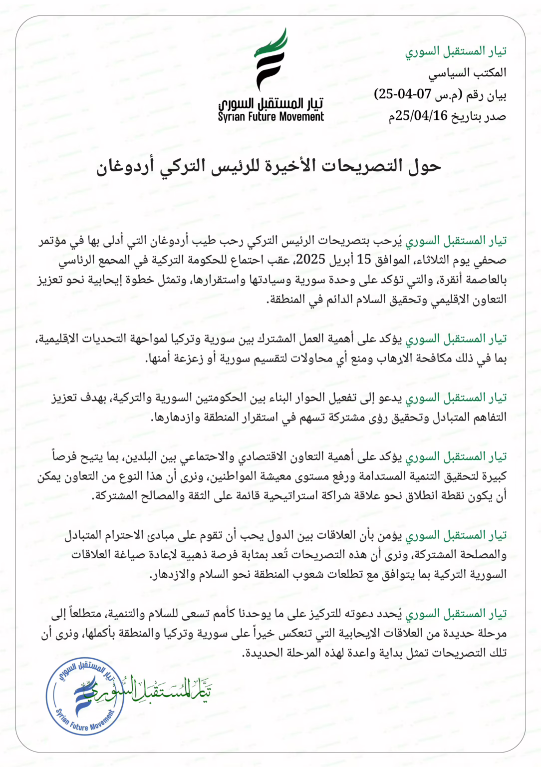 تيار المستقبل السوري يؤمن بأن العلاقات بين الدول يجب أن تقوم على مبادئ الاحترام المتبادل والمصلحة المشتركة، ونرى أن هذه التصريحات تُعد بمثابة فرصة ذهبية لإعادة صياغة العلاقات السورية التركية بما يتوافق مع تطلعات شعوب المنطقة نحو السلام والازدهار.