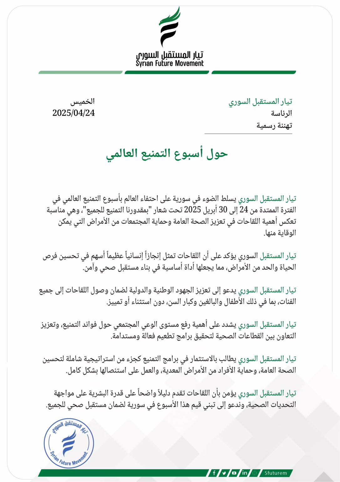 تيار المستقبل السوري يطالب بالاستثمار في برامج التمنيع كجزء من استراتيجية شاملة لتحسين الصحة العامة، وحماية الأفراد من الأمراض المعدية، والعمل على استئصالها بشكل كامل.