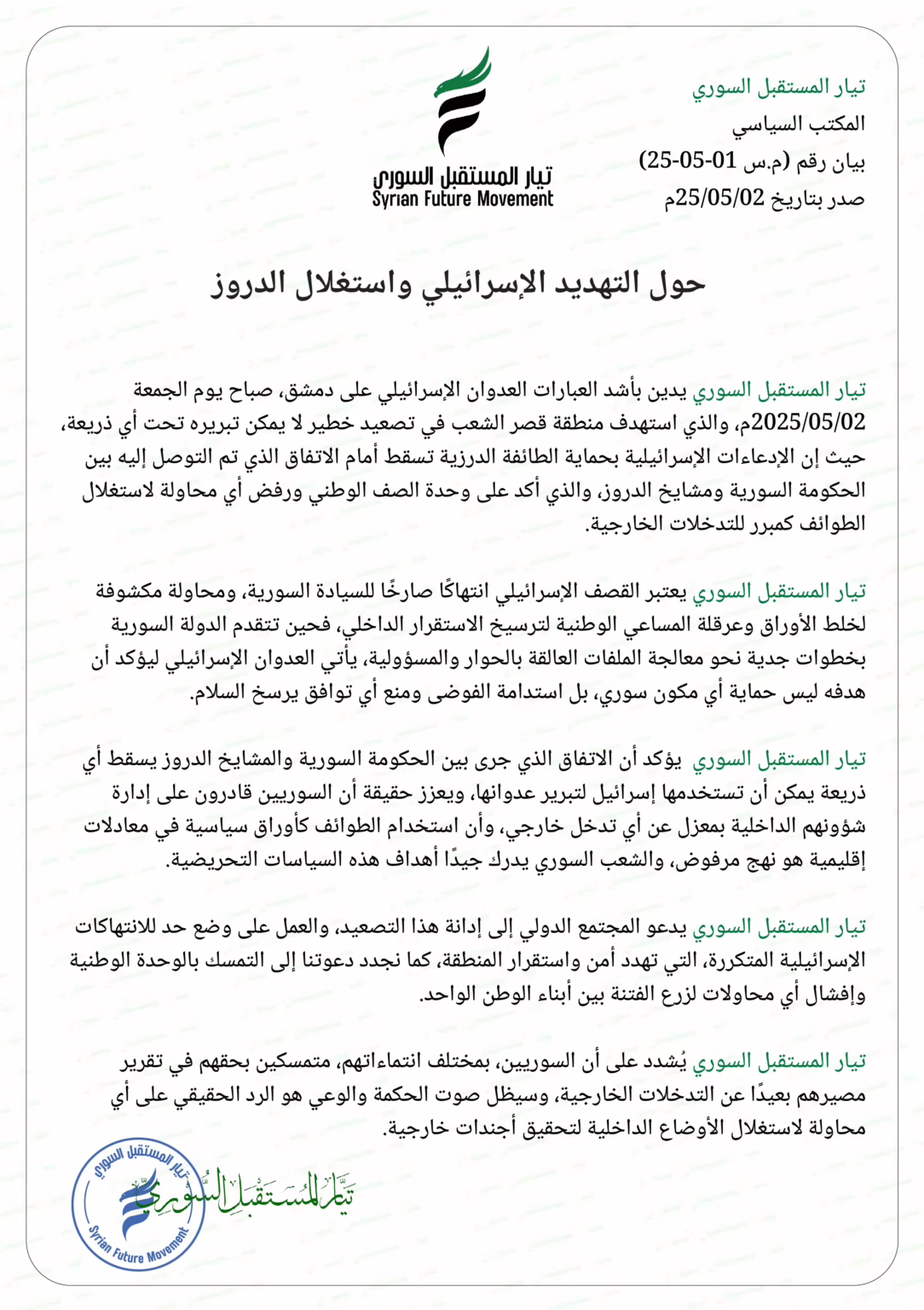 تيار المستقبل السوري يدعو المجتمع الدولي إلى إدانة هذا التصعيد، والعمل على وضع حد للانتهاكات الإسرائيلية المتكررة، التي تهدد أمن واستقرار المنطقة، كما نجدد دعوتنا إلى التمسك بالوحدة الوطنية وإفشال أي محاولات لزرع الفتنة بين أبناء الوطن الواحد.