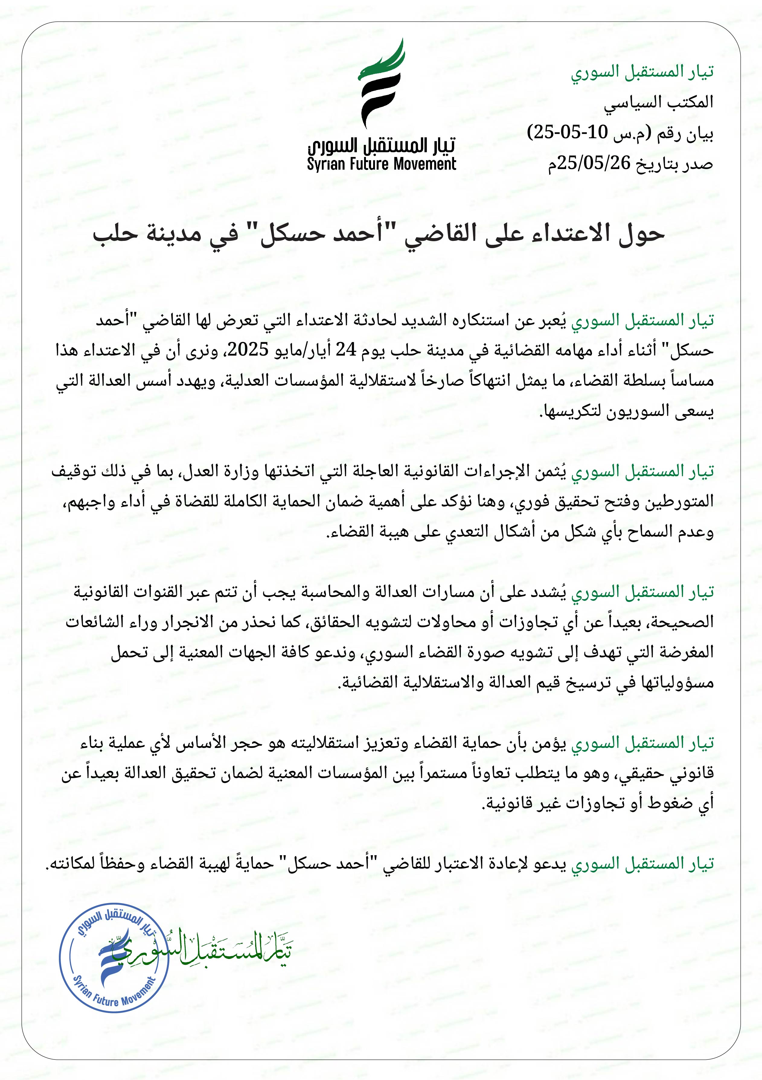 تيار المستقبل السوري يُعبر عن استنكاره الشديد لحادثة الاعتداء التي تعرض لها القاضي "أحمد حسكل" أثناء أداء مهامه القضائية في مدينة حلب يوم 24 أيار/مايو 2025، ونرى أن في الاعتداء هذا مساساً بسلطة القضاء، ما يمثل انتهاكاً صارخاً لاستقلالية المؤسسات العدلية، ويهدد أسس العدالة التي يسعى السوريون لتكريسها.