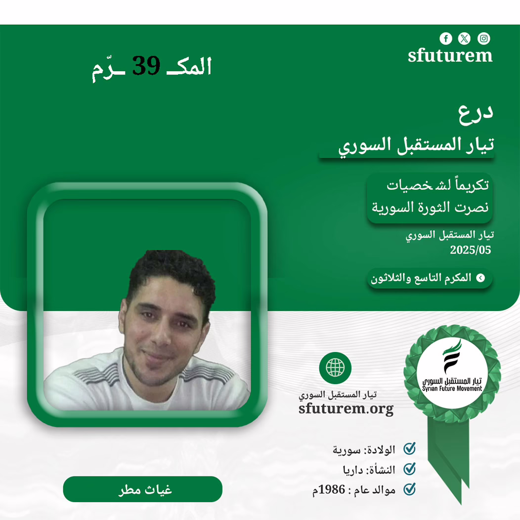 فإننا نقدّم درع تيار المستقبل السوري هذا الأسبوع لـِ سفير الورد "غياث مطر" درعاً سورية رمزيَّاً يحمل رؤيتنا ومنهجنا الوطنيَّ الجامع.