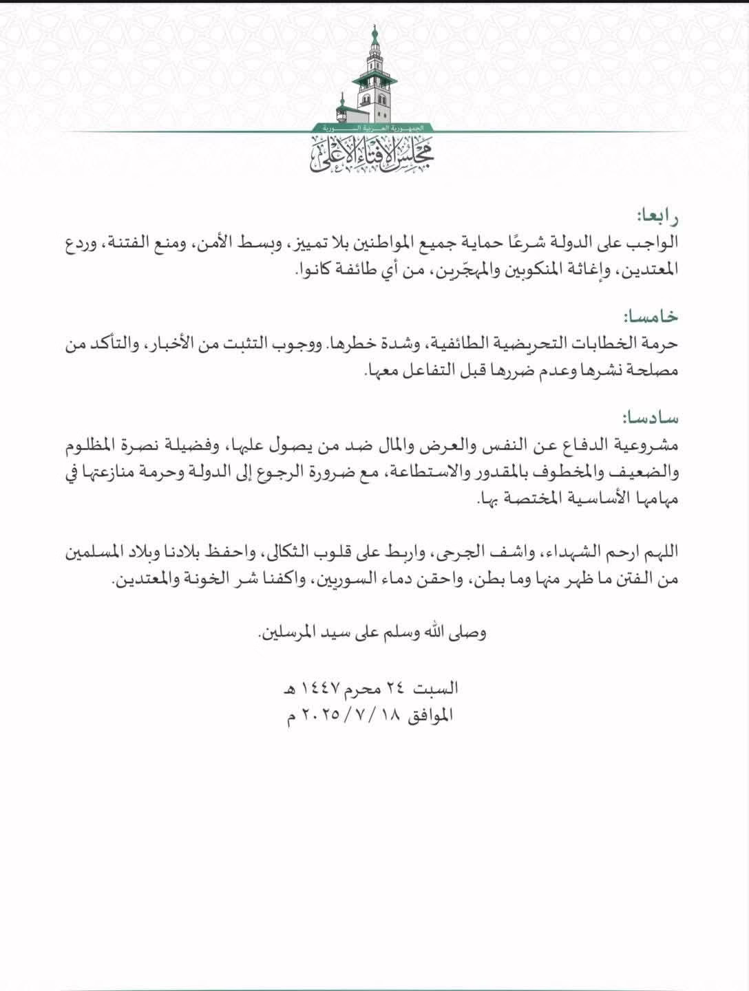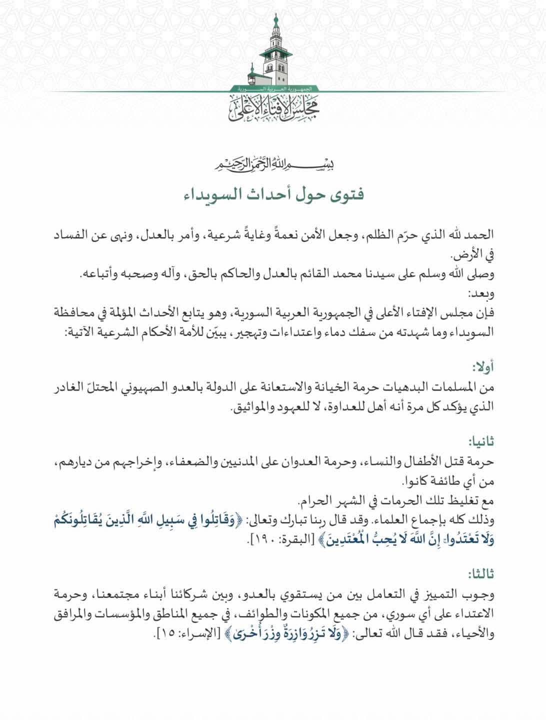 فتوى مجلس الإفتاء الأعلى حول أحداث السويداء