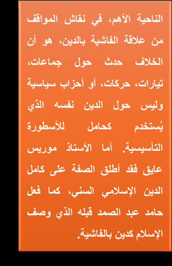 الناحية الأهم، في نقاش المواقف من علاقة الفاشية بالدين، هو أن الخلاف حدث حول جماعات، تيارات، حركات، أو أحزاب سياسية وليس حول الدين نفسه الذي يُستخدم كحامل للأسطورة التأسيسية. أما الأستاذ موريس عايق فقد أطلق الصفة على كامل الدين الإسلامي السني، كما فعل حامد عبد الصمد قبله الذي وصف الإسلام كدين بالفاشية.