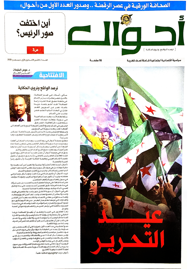 تسلم رئيس تيار المستقبل السوري الدكتور زاهر بعدراني النسخة الأولى من العدد الأول لمجلة أحوال، وهي صحيفة ورقية في عصر الرقمنة، ترصد الواقع وتروي الحكاية.