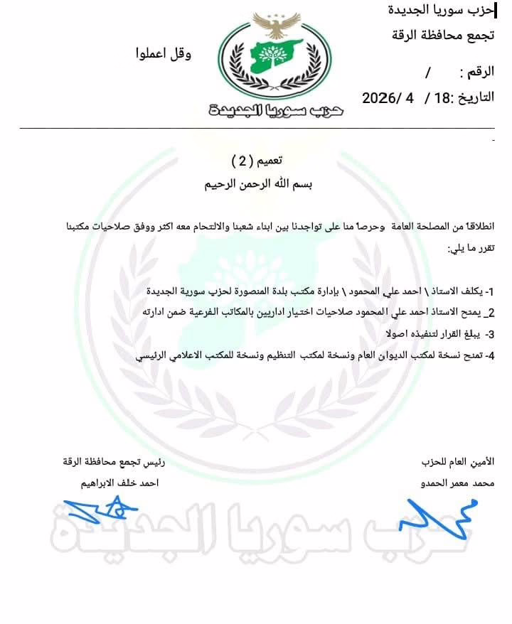 - يُبارك للإخوة في الحزب هذا الإنجاز التنظيمي، ويعده بالتعاون والتكامل في كل ما يخدم الصالح العام السوري، ويحقق طموحات شعبنا في الحرية والكرامة والعدالة.