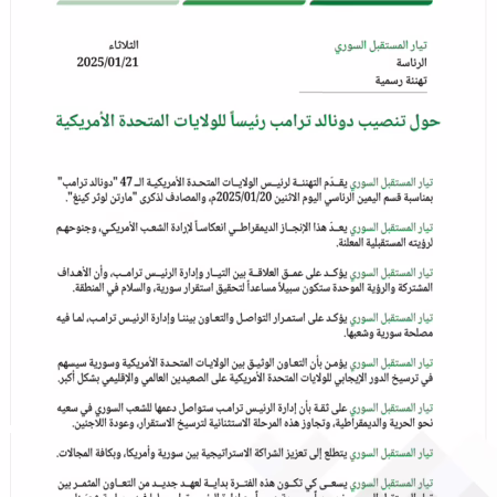 دونالد ترامب يتولى الرئاسة، وتيار المستقبل السوري يتطلع إلى تعاون مثمر يضمن استقرار سورية والشعب السوري.