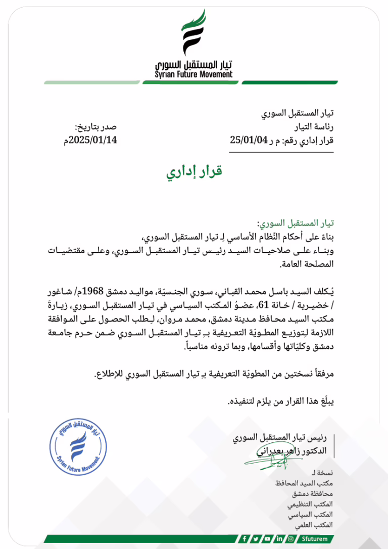 تفاصيل تكليف باسل محمد القباني بزيارة مكتب محافظ دمشق في إطار تيار المستقبل السوري.