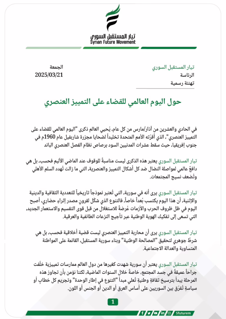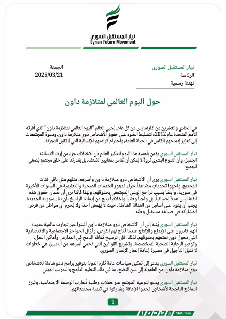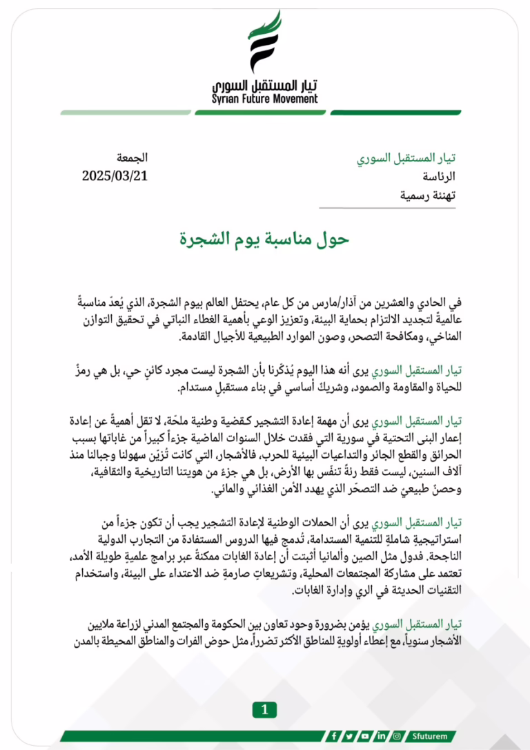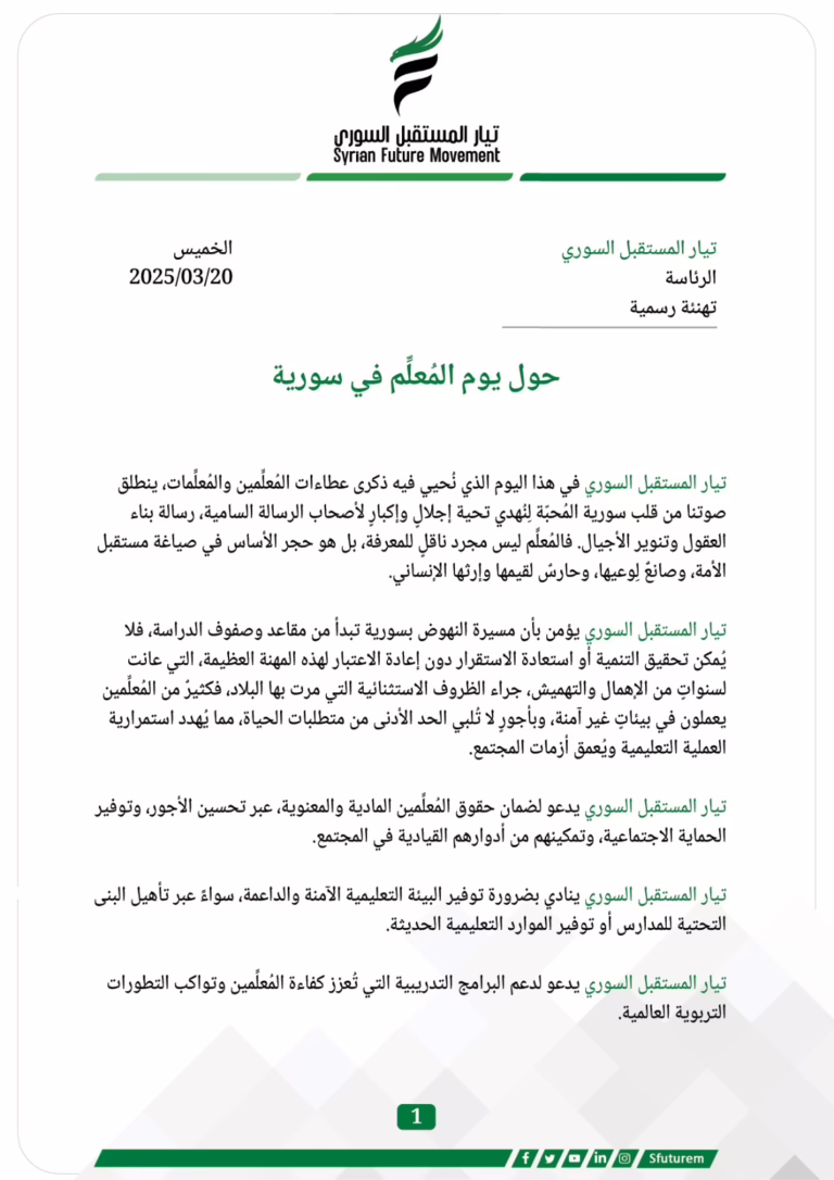 أخبار التيار: أصدر مكتب الرئاسة لـِ تيار المستقبل السوري تهنئة رسمية: حول اليوم العالمي للسعادة. أصدر مكتب الرئاسة لـِ تيار