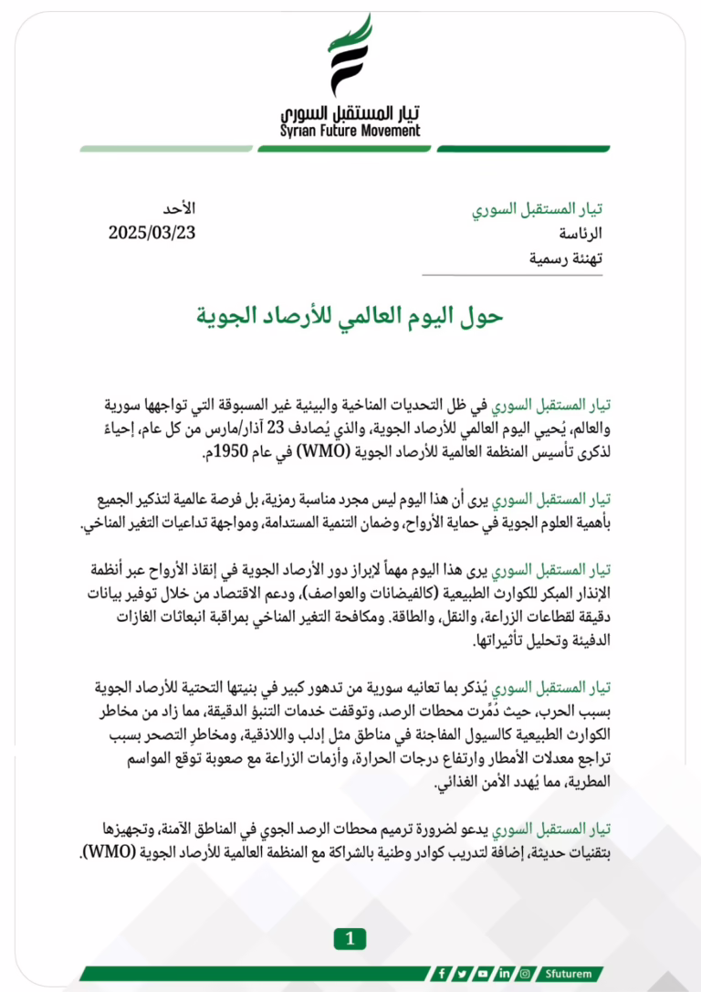 أخبار التيار: أصدر مكتب الرئاسة لـِ تيار المستقبل السوري بيان تهنئة بعنوان: حول اليوم العالمي للأرصاد الجوية. أصدر مكتب الرئاسة