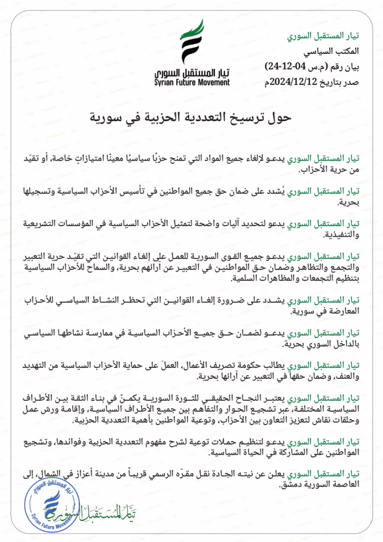 تيار المستقبل السوري يدعو لإلغاء جميع المواد التي تمنح حزبًا سياسيًا معينًا امتيازاتٍ خاصة، أو تقيّد من حرية الأحزاب. تيار