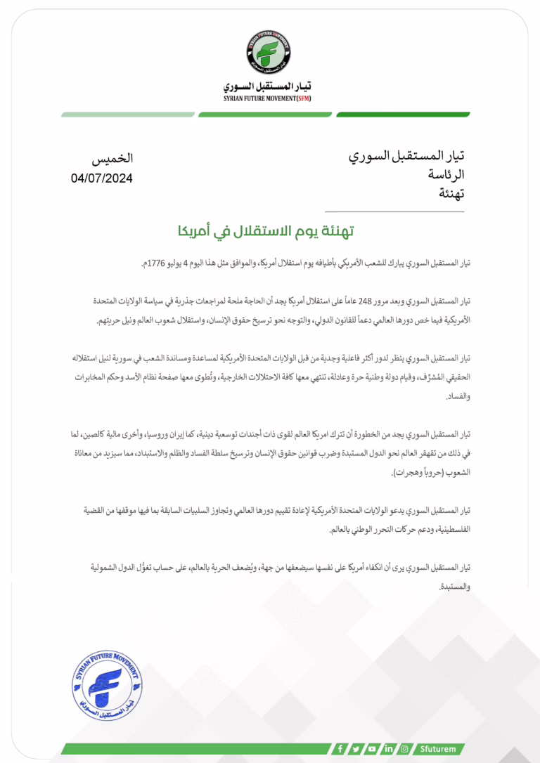 أخبار التيار:صدر عن مكتب الرئاسة لِـ تيار المستقبل السوري بطاقة تهنئة بعنوان: تهنئة يوم الاستقلال في أمريكا. نشر المكتب الإعلامي
