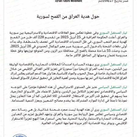 منظومة التعاون بين العراق وسورية تتجلى في هدية العراق لسورية