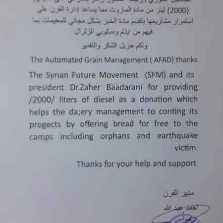 رسالة شكر من (AFAD) لتيار المستقبل السوري (SFM) على تقدمة الوقود لهم من أجل المساعدة في استمرار مشروعها بتقديم مادة