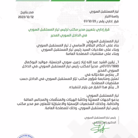 تيار المستقبل السوريالرئاسةقرار إداري رقم: ر 23/12/01صدر بتاريخ: 2023/12/12 قرار إداري تيار المستقبل السوري:بناءً على أحكام النِّظام الأساسي لِـ تيار