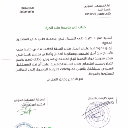 أخبار التيار: برعاية وتوجيه من تيار المستقبل السوري، قام أطباء أسنان السنة الخامسة في جامعة حلب الحرة بزيارة "تجمع طيبة"