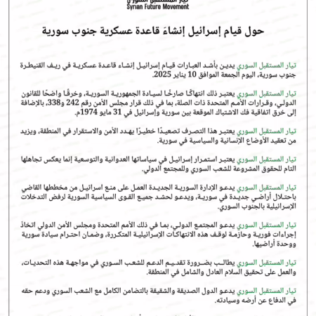 تيار المستقبل السوري يبارك انتخاب جوزيف عون رئيساً للبنان ويدعو لتعزيز العلاقات بين البلدين.