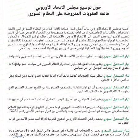 مجلس الاتحاد الأوروبي يضيف ثلاثة أفراد من النظام السوري لقائمة العقوبات لتجميد الأصول وحظر السفر.