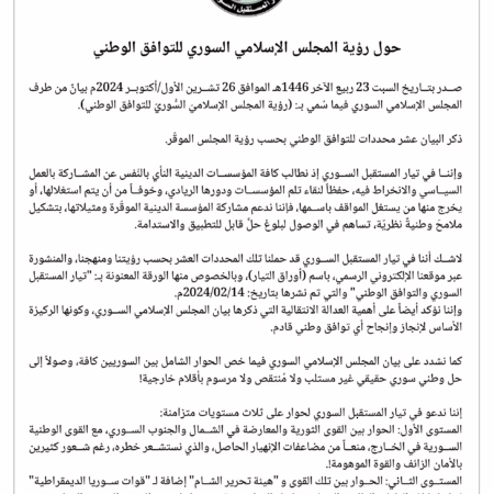 بيان المجلس الإسلامي السوري حول رؤية التوافق الوطني، مع عشر محددات تساهم في الحلول المستدامة.