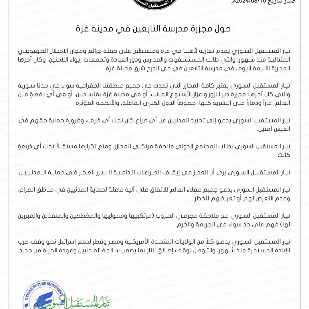 تيار المستقبل السوري يقدم تعازيه لأهلنا في غزة وفلسطين على جملة جرائم ومجازر الاحتلال الصهيويني المتتالية منذ شهور