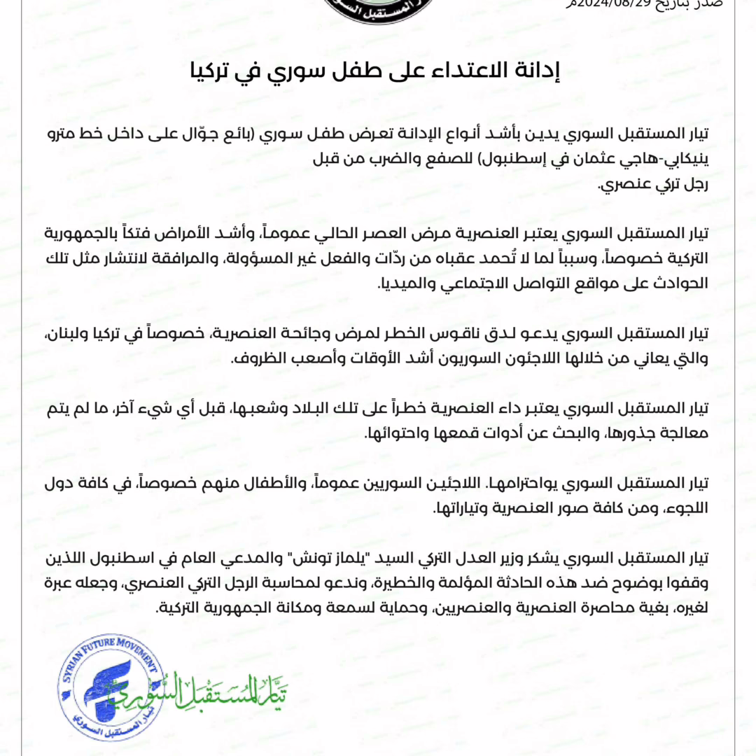 بيان يلفت الانتباه لخطورة العنصرية. إدانة الاعتداء على طفل سوري في إسطنبول تثير القلق حول وضع اللاجئين.