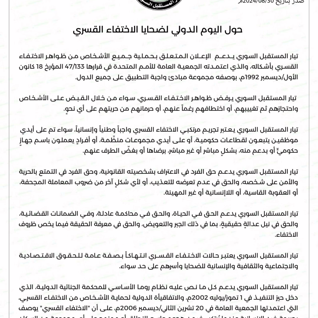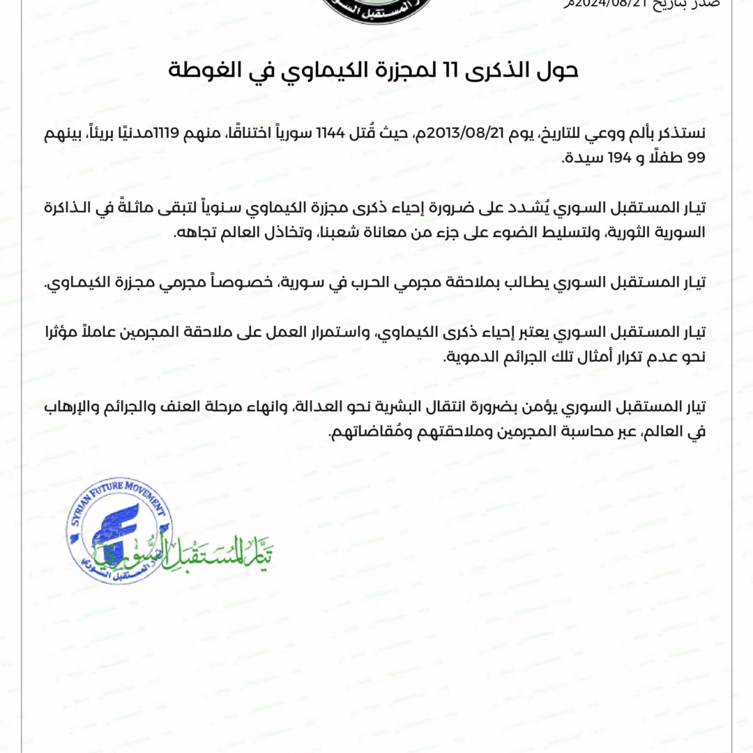 تيار المستقبل السوري يعبر عن حزنه تجاه مجزرة بلدة الدحلة في دير الزور وبلدة البوليل ويدعو لتحقيق العدالة.