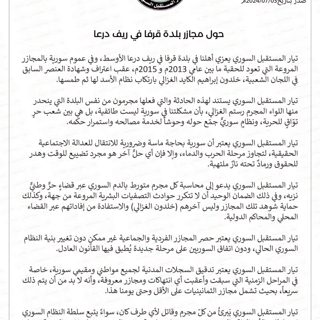 إسطنبول _ تركيا بسم الله الرحمن الرحيم السَّلامُ عليكُم ورحمةُ اللهِ وبركاتُه: إلى شعبِنَا السُّوريِّ الحُرِّ الثّائرِ والصّامد مِن درعَا