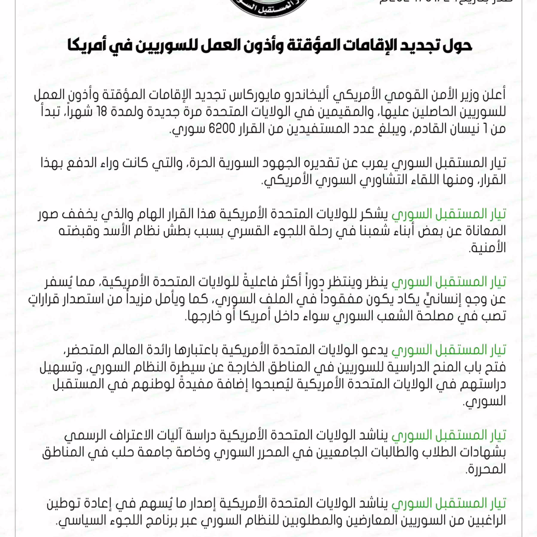 تجديد الإقامات المؤقتة وأذون العمل للسوريين في أمريكا لمدة ١٨ شهراً بدءًا من نيسان المقبل.