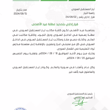قرار إداري بتحديد عطلة عيد الأضحى لمكاتب تيار المستقبل السوري من 16 إلى 20 يونيو 2024.