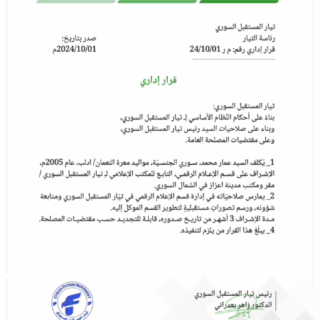 قرار إداري | تعيين السّيد عمار محمد، مديراً لقسم الإعلام الرقمي لـِ تيار المستقبل السوري.