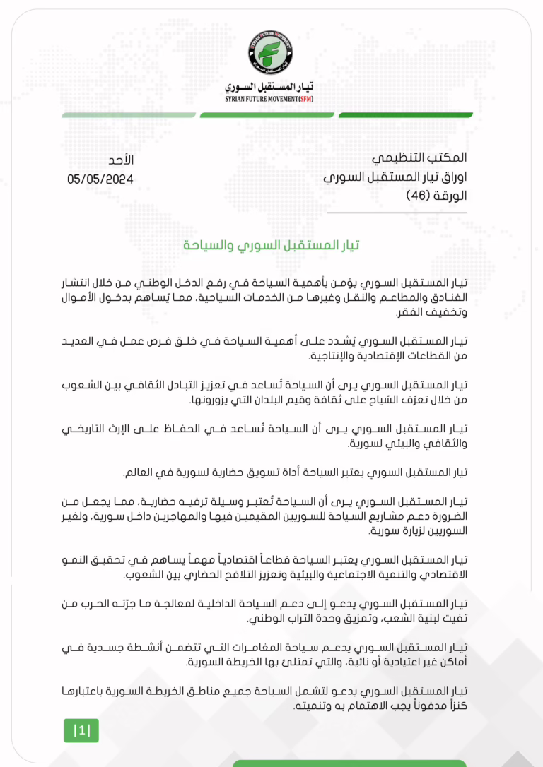 تيار المستقبل السوري يؤمن بأهمية السياحة في رفع الدخل الوطني و يُشدد على أهمية السياحة في خلق فرص عمل