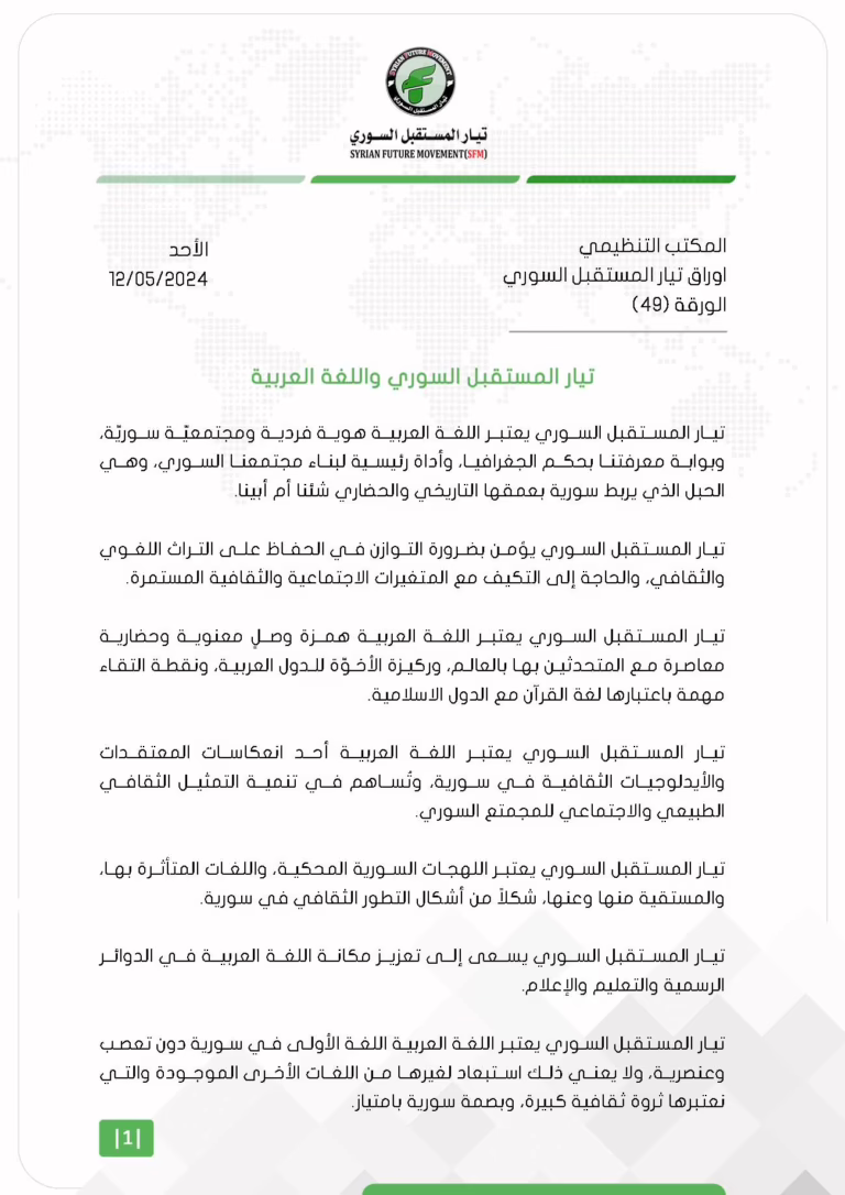 تيار المستقبل السوري يبرز أهمية اللغة العربية كأداة لبناء مجتمع سوري متوازن وجامع.