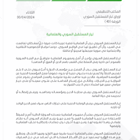 تيار المستقبل السوري يدعو إلى حوار ثقافي فكري سوري بين مختلف التيارات حول مفهوم العلمانية