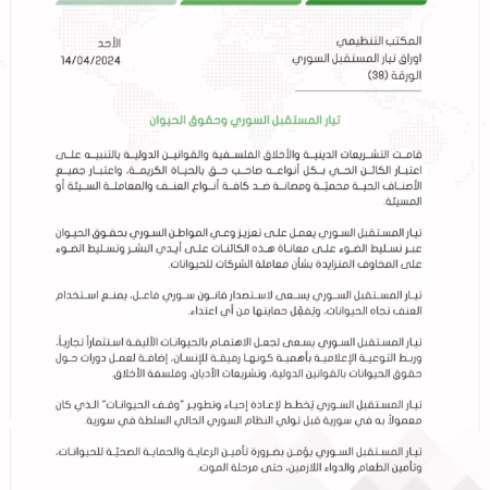 تيار المستقبل السوري وحقوق الحيوان: تعزيز الوعي حول حقوق الحيوانات وحمايتها من العنف والمعاملة السيئة.