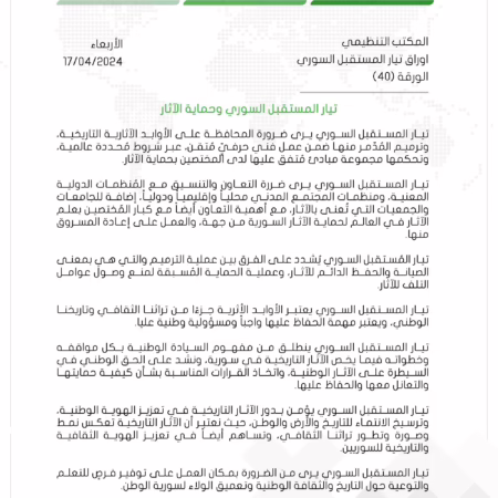 تيار المستقبل السوري يعتبر الحفاظ على الأوابد الأثرية واجباً وطنياً ويشدد على أهمية التعاون الدولي.