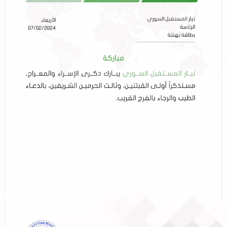 تيار المستقبل السوري يهنئ الجميع بذكرى الإسراء والمعراج ويدعو إلى الفرج القريب.