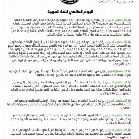 تيار المستقبل السوري يؤكد على الدور الحيوي للغة العربية، كوسيلةٍ لتعزيز التواصل الثقافي والحضاري بين الشعوب
