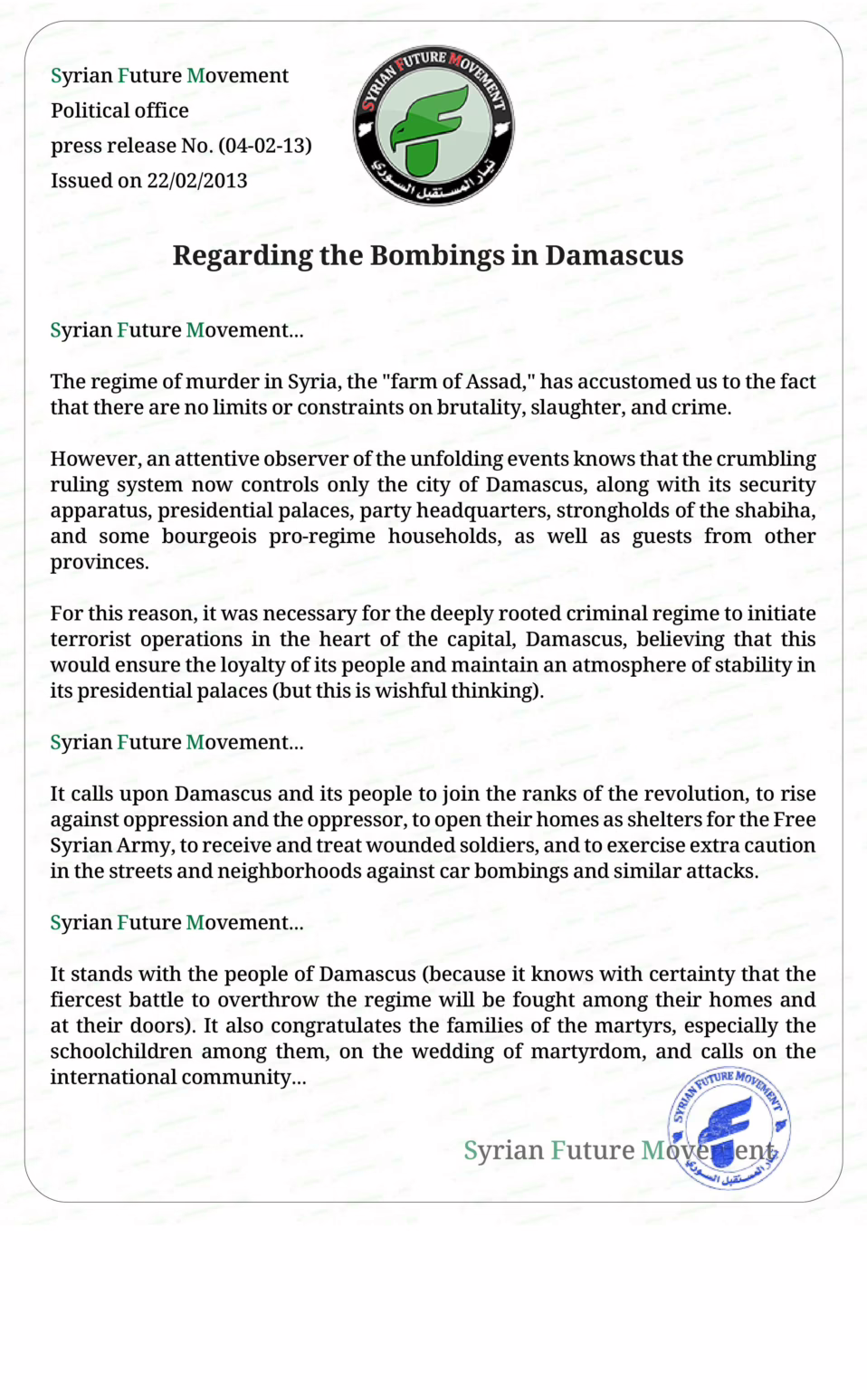 It calls upon Damascus and its people to join the ranks of the revolution, to rise against oppression and the oppressor, to open their homes as shelters for the Free Syrian Army, to receive and treat wounded soldiers, and to exercise extra caution in the streets and neighborhoods against car bombings and similar attacks.