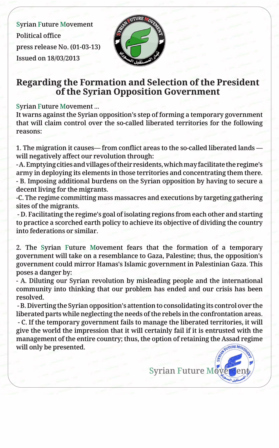 2- The Syrian Future Movement fears that the formation of a temporary government will take on a resemblance to Gaza, Palestine; thus, the opposition’s government could mirror Hamas’s Islamic government in Palestinian Gaza. This poses a danger by: